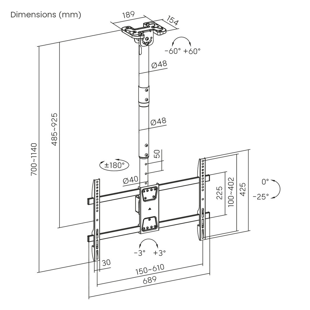 Een plafondbeugel waarbij aan vrijwel alles is gedacht. De lengte van deze TV Plafondbeugel is in te stellen op een lengte van 485 t/m 925 mm en hij is geschikt voor schermen met een VESA gatenpatroon van minimaal 200 x 200 mm tot maximaal 600 x 400 mm met een gewicht tot maximaal 60 kg. Daarmee is het scherm geschikt voor de meeste schermen van 43 inch tot maximaal 86 inch.