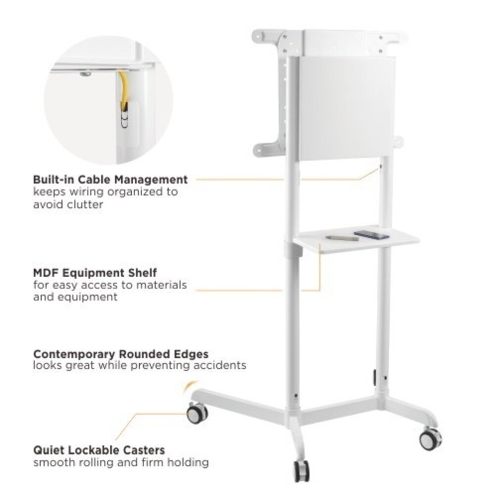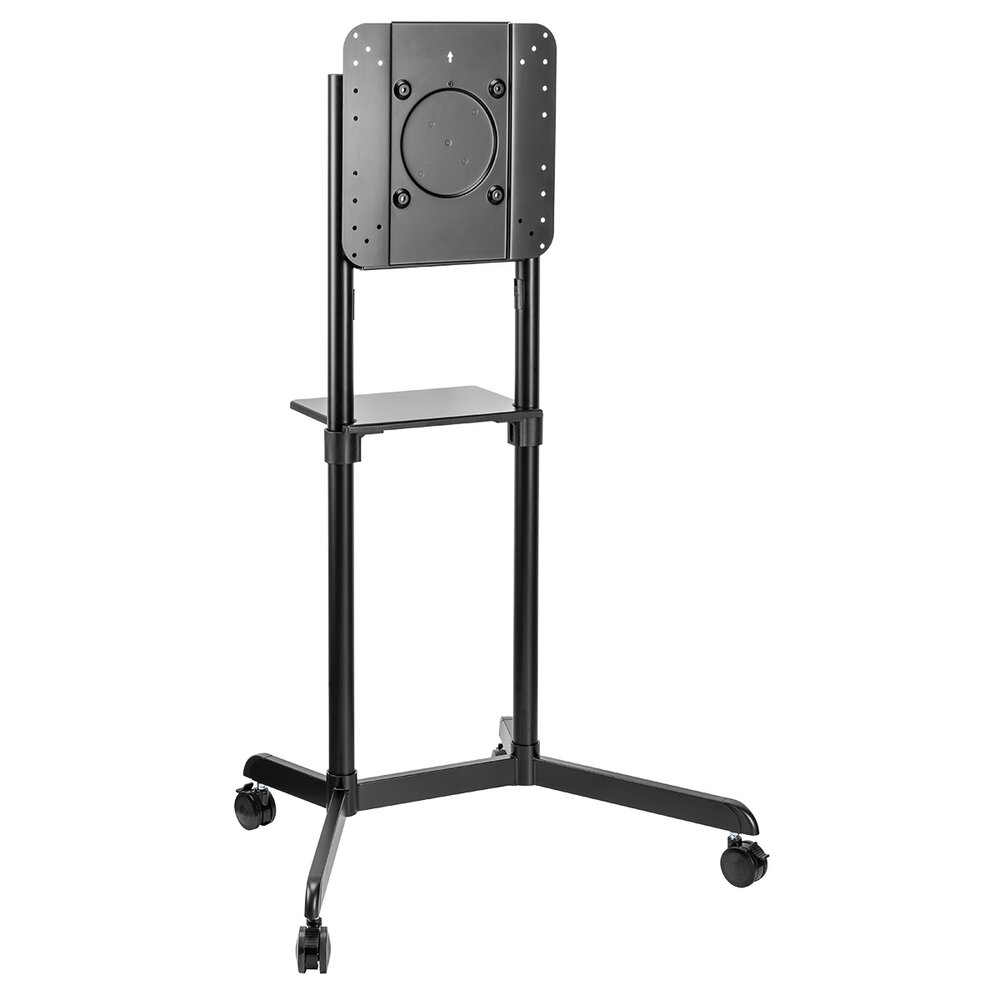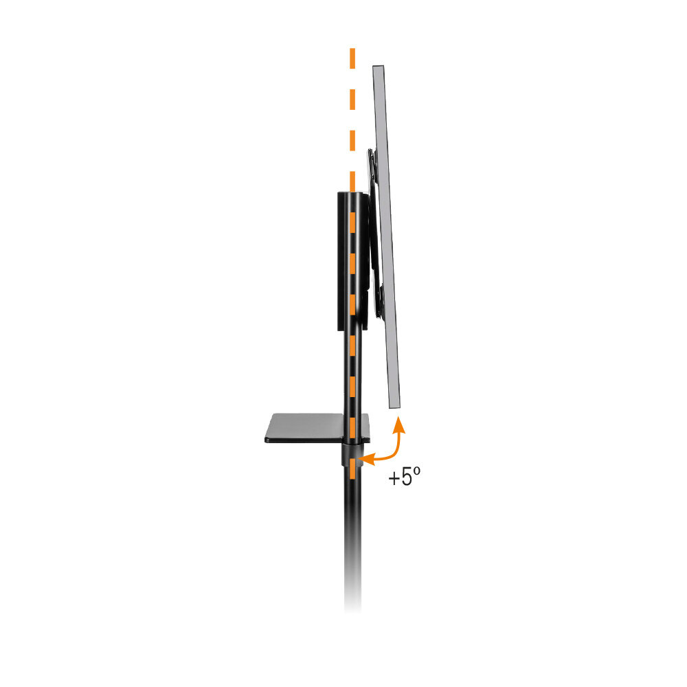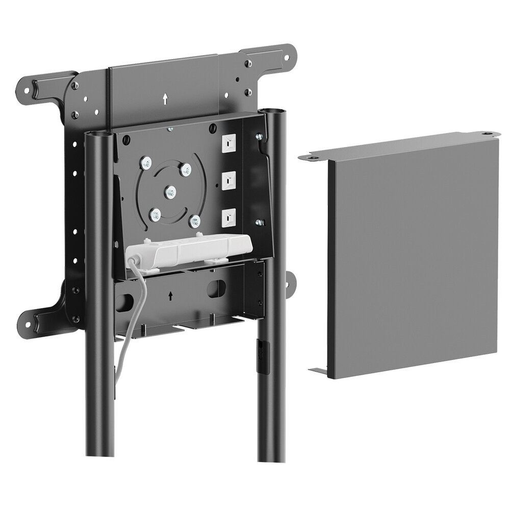 Daarnaast is deze TV standaard voorzien van meerdere innovatieve foefjes die het ideaal maakt om hem in een zakelijke omgeving te gebruiken, zo kun je de bekabeling niet alleen netjes door de buizen vanaf de achterzijde van het scherm richting de vloer brengen, maar is hij voorzien aan de achterzijde van een afgesloten bak. Hier kun je bijvoorbeeld een mini PC en of een stekkerblok in plaatsen, zodat al je apparatuur netjes en zonder veel kabels in het zicht kan worden aangesloten. Bovendien is hij voorzien van een plateau die je met 5 kg kunt belasten en een afmeting van 420 x 290 mm, groot genoeg voor bijvoorbeeld de meeste laptops of natuurlijk een video conferentie camera.