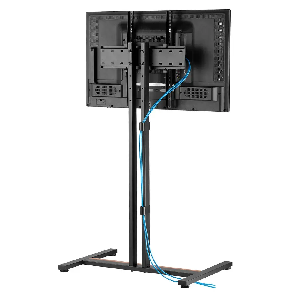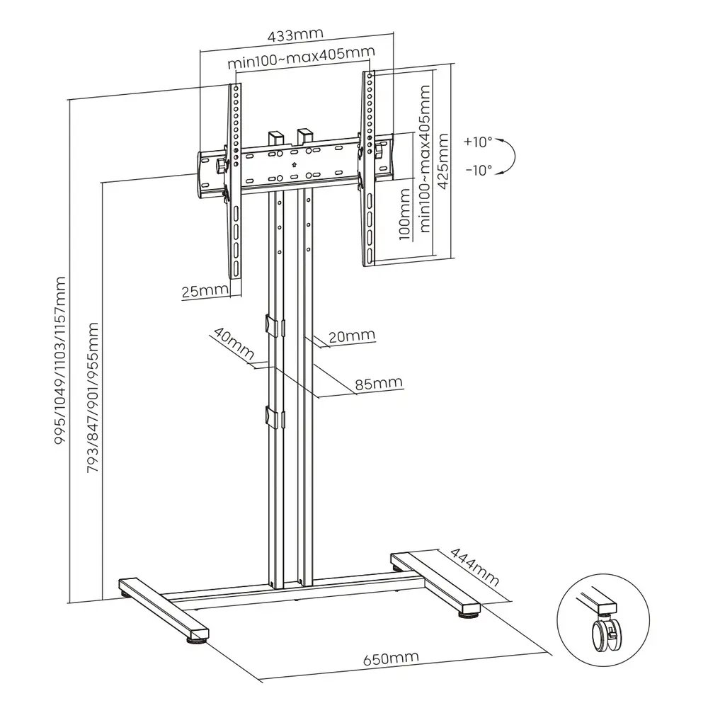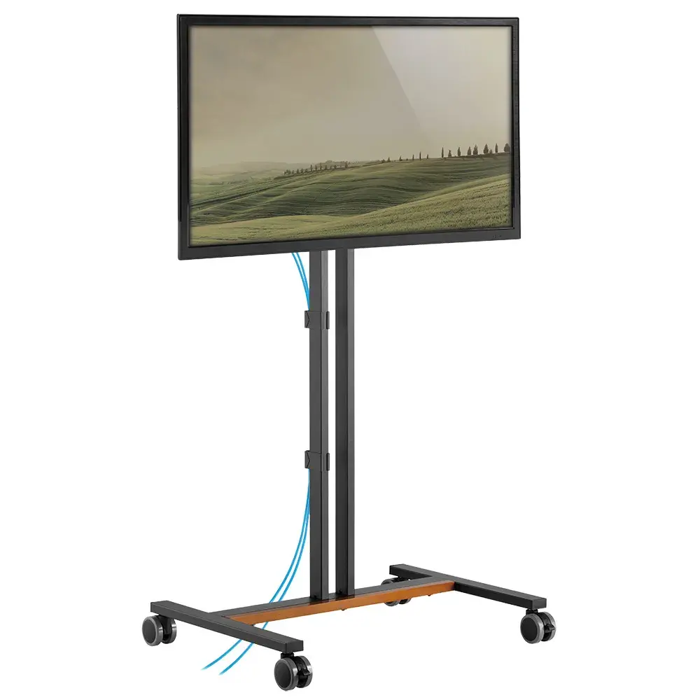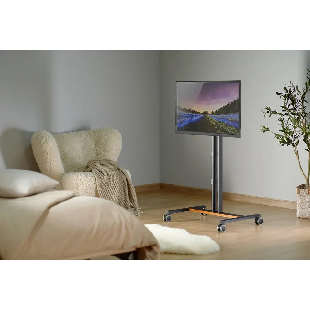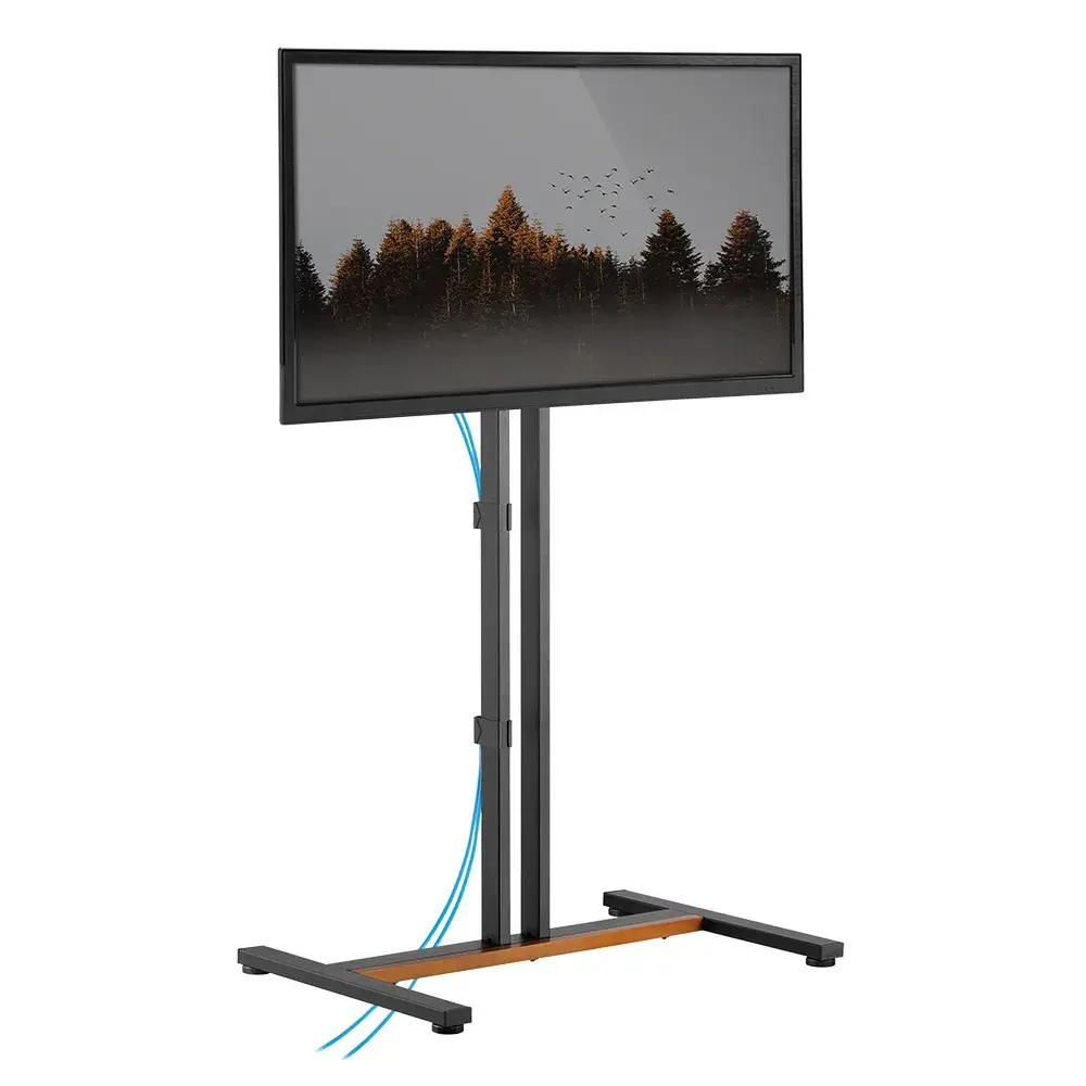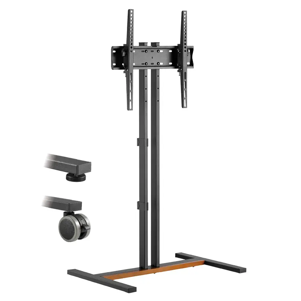 Een eenvoudige, maar zeer nette TV standaard die geleverd wordt met zowel wieltjes als stelpootjes. Je kunt hier dus kiezen of je een vaste of verrijdbare TV standaard wilt hebben. De TV kun je op verschillende hoogtes instellen. Het hart van de VESA kun je op een minimale hoogte van 79.3 mm tot een maximale hoogte van 95.5 cm monteren. Het scherm maximaal 35 kg wegen.
