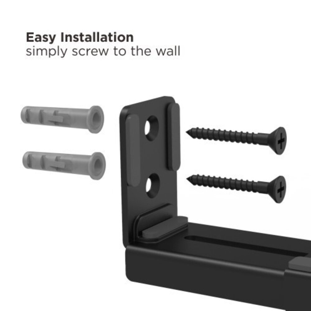 De installatie is super eenvoudig, je schroeft de beugeltje op de juist afstand van elkaar tegen de muur met de 2 bijgeleverde pluggen en schroeven. Stelt de juiste diepte af voor de soundbar die je hebt en zet de soundbar erin.