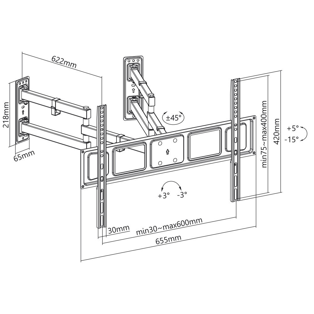 Je kunt na montage, het scherm nog kantelen (+ 5° / - 15°), draaien 90° (zolang de muur het toe laat) en er is een rotatie correctie van + 3° / - 3°. Het vesa gatenpatroon is 100 x 100 tot maximaal 600 x 400 mm en het scherm mag maximaal 45 kg wegen.
