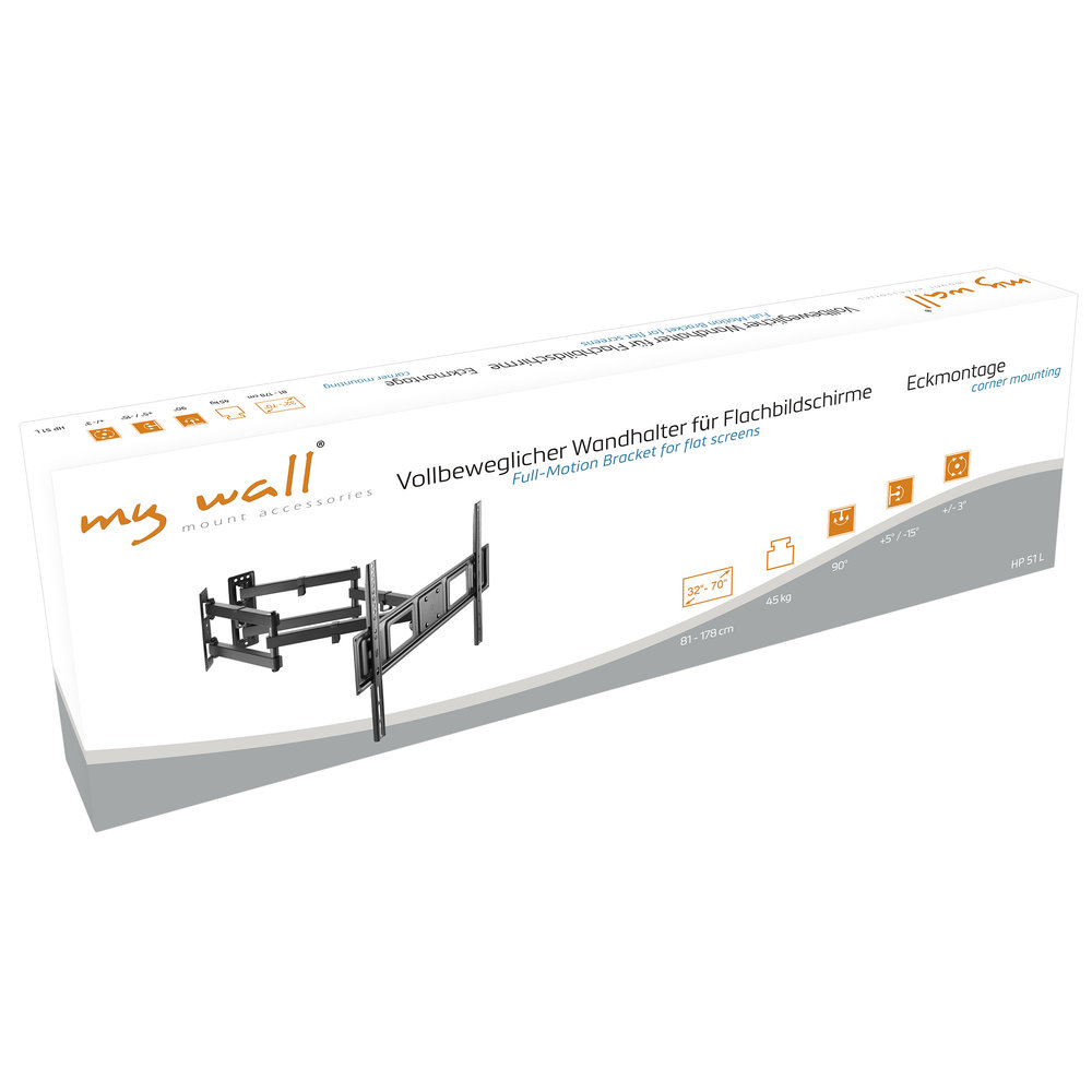 De HP51 een volledig beweegbare TV Muurbeugel, die je in een hoek van de kamer kunt monteren. Dankzij de gespleten armen kun je heel eenvoudig de TV monteren in een "dooie" ruimte in de hoek van de kamer. Dankzij de grote beweegbaarheid, kun je eenvoudig de juiste kijkhoek vinden. De bekabeling kun je netjes aan de achterzijde wegwerken, om zo netjes in de hoek in één kabelgoot naar bestemming te begeleiden.