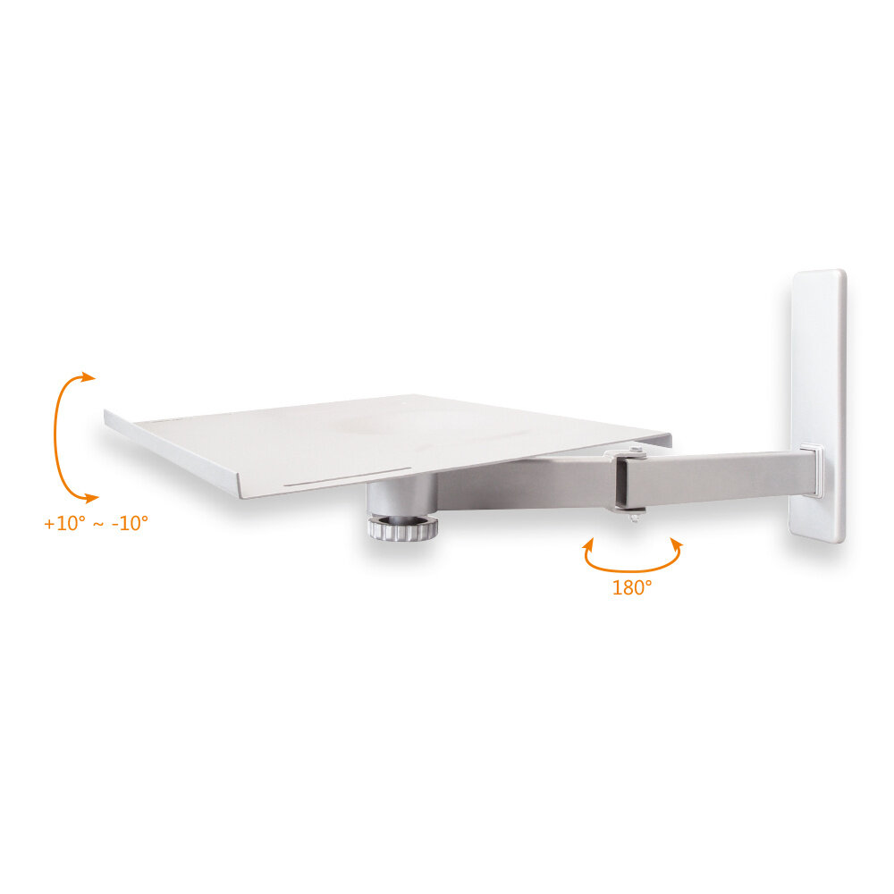Officieel gemaakt voor de beeldbuis Tv's en monitoren, maar tegenwoordig meer dienst doende als een wandbeugel voor een Dvd speler, Laptop, Speaker of andere apparaten. Zo weten wij dat hij ook regelmatig gebruikt wordt voor een Airfryer bijvoorbeeld. De afmeting van het plateau is 370 x 300 mm (B x D) en draagvermogen van maximaal 35 Kg, waardoor het uitermate stevig is. Je kunt het plateau volledig van links naar rechts draaien en naar voren en naar achter kantelen +/-10°.