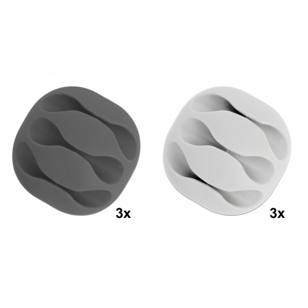 Een set van 6 zelfklevende kabelclips met 3x een grijze en 3x een witte kabelclip. Aan te brengen op elk vlak oppervlak en ideaal om ervoor te zorgen dat de kabels niet van het bureau af vallen of om een poort te ontzien van het zware gewicht, dat is bij sommige actieve kabels het geval en bij de gevoelige USB C poorten soms wel verstandig.